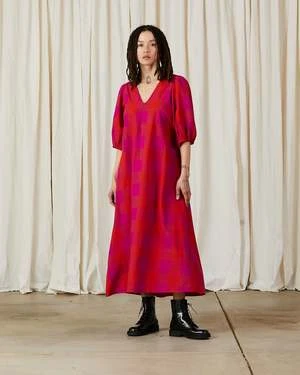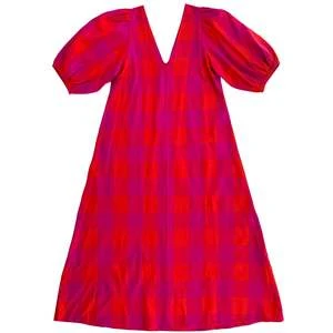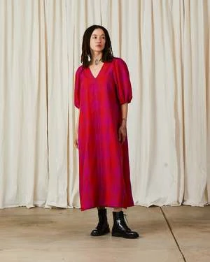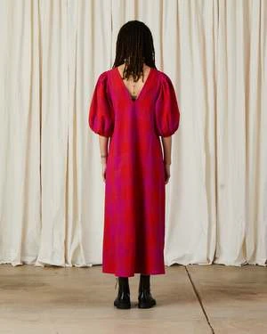 Silk noil v-neck (front and back) dress with puffed sleeves and full maxi skirt.