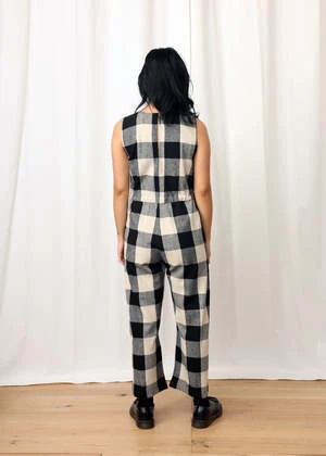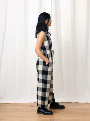 V-neck sleeveless jumpsuit with back slit opening, drawstring at waist, pockets and relaxed fit. Length hits above ankle.