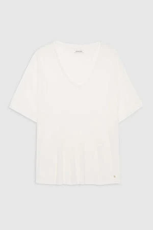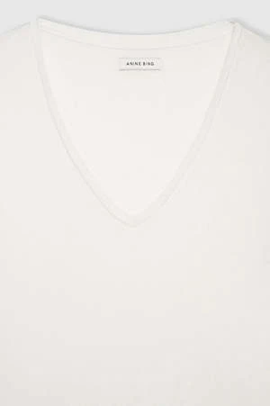 A relaxed basic constructed from a lightweight modal-cashmere jersey blend with a soft hand and natural drape. The Vale Tee features a deep V-neckline with dropped short sleeves and a longer hem for an effortlessly laidback look. Finished with a small stitched ANINE BING monogram charm at the wearer’s bottom-left hem.