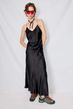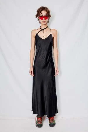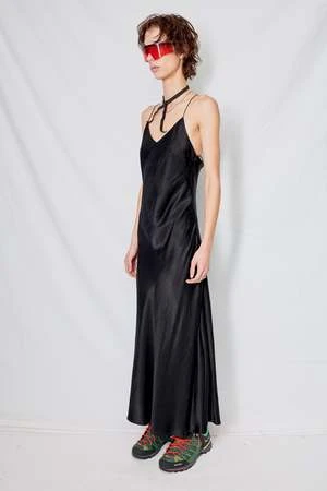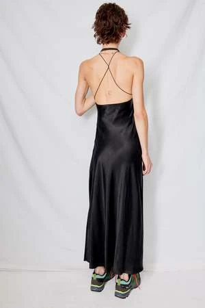 Black Cupro Bias Strap Dress from Assembly New York. Low back with criss-cross straps. Side zip closure.