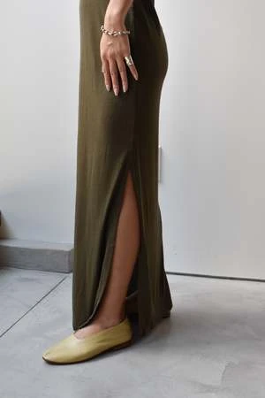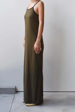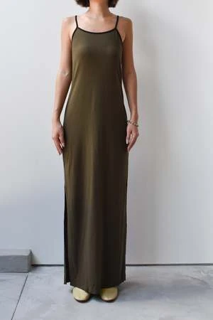 Simple slip dress with contrast piping and side slits.
