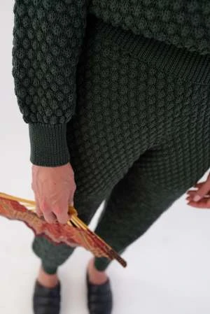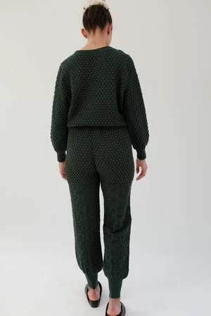 Gorgeous hand knit pant, with a unique pattern and texture, medium weight. Washable, soft luxurious cotton yarn. 100% Pima cotton. Gentle elastic at waist and 4″ ribbed cuff at ankle. Exclusive to Beklina. Runs true to size.