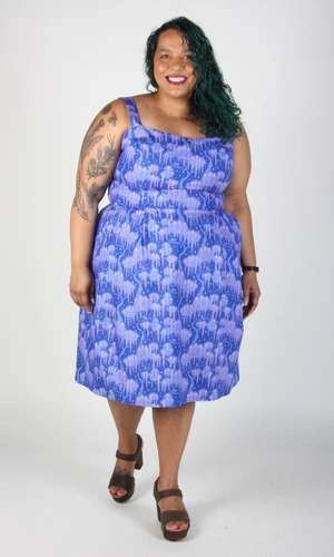 The dress and lining are both 100% cotton, and the dress closes with an invisible zipper down the back. Grosbeak measures about 40″ from shoulder to hem. Marie is 5’1″ and wears our size 18 – you can see our size chart here!