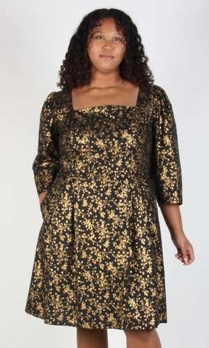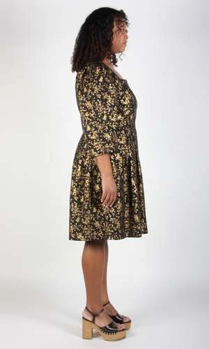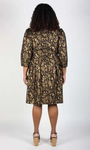 Birds of North America’s Helldiver Dress is fit for a princess! This stunning dress is tailored to perfection, perfectly complimenting the body. It features a square neck, puff sleeves and a fitted bodice. The skirt features an A-line cut and pleats, hitting just below the knee. The elegant print features bright gold highlights on a black background.