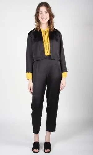 Parakeet is a super chic, sleek satin pant with darts on the front and back. It closes with a back invisible zipper. This fabric has a beautiful silk- like look, but contains no animal products. Shown here with with the Chuck Will’s Widow Top in Crushed Gold.