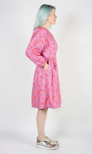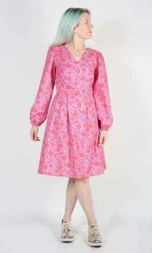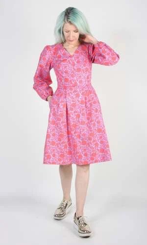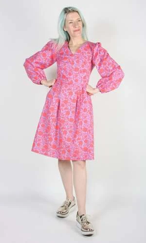 Yellowhammer is a lovely fall dress with long full sleeves, a mid-knee length skirt with pockets, and a flattering V-neck. It closes with a back invisible zipper and the skirt is lined in soft satin.