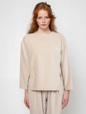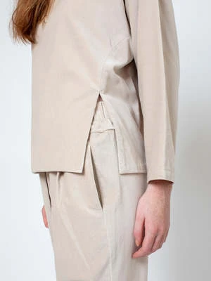 The Slit Top by Black Crane is a crew neck, drop shoulder shirt featuring slits at the front, and a button closure on the back. Soft to the touch, the velvety cotton lining makes it even cozier.