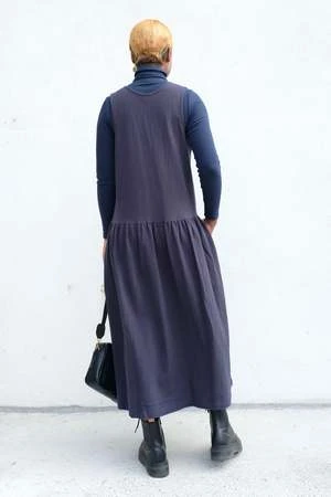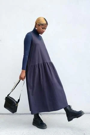 A relaxed tank dress with a scooped neck, side seam pockets and shirred detail around the waist. Cut from a soft textured 100% cotton fabric.