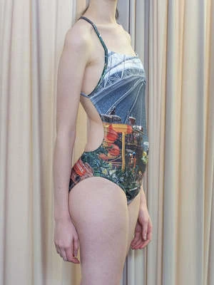 Bless has digitally printed holiday photos on this lovely swimsuit. Crossback straps, straight across the chest, with a higher (but not too high) cut leg.
