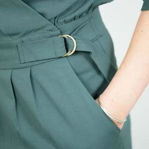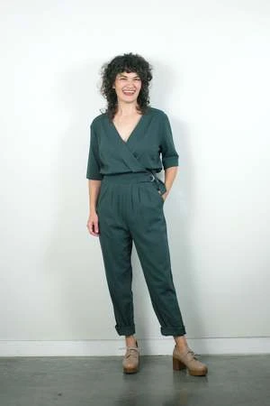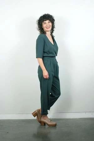 An elegant, relaxed jumpsuit that just feels good to wear. The crossover bodice looks great on lots of different bodiesthe shape creates plenty of room for larger chests, and the fabric has plenty of drape so it lays well over smaller chests too. It has hip pockets for practicality, and an attached waist belt that you can adjust for the perfect fit. Wear this one with ankle boots and a cardigan for a job interview, or style it with heels and big earrings for a holiday party.