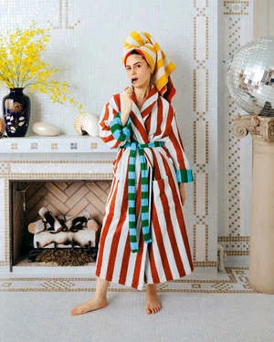 Cotton terry bathrobe with shawl collar, patch pockets, and tie. 95% cotton terry, 5% polyamide, 430 GSM. This item is Oeko-Tex Standard 100 certified (no harmful chemicals were used during production). Made in Portugal.