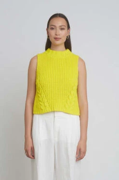 Lily is an elevated, crew-neck sweater-tank to be layered or worn alone as an outfit staple. The cotton fisherman-rib stitch with engineered-cable detail gives this piece an effortless, transitional feel. Lily is slim with ease and has a slightly cropped proportion body that styles back to high-waist pants.