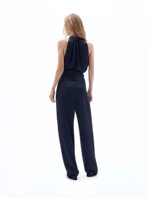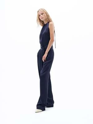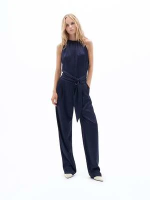 Crushed satin belted jumpsuit with pleat detailing.