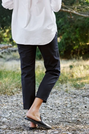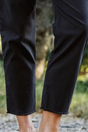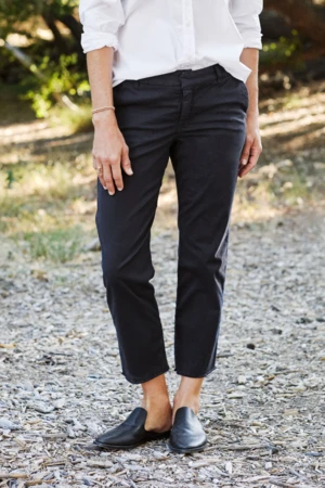Frank & Eileen Wicklow Chino Washed Black. The Wicklow chino brings comfort and style for any season. The chinos are a relaxed fit with a raw distresssed hem, stretchy fabric, and has a zipper and hook closure.