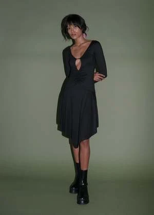 The Singer, a long sleeve, knee length dress with an open back. Features a keyhole low cut neckline, ruched waistline, and a flowy pointed hem.