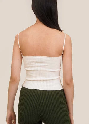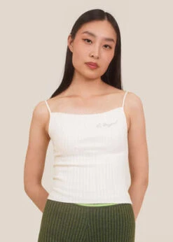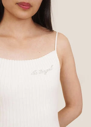 Shrunken rib knit ivory camisole with “Be Angel” rhinestone embellishment at front chest. Features skinny shoulder straps and a low back.