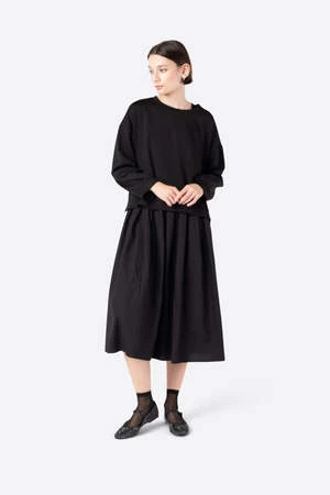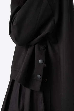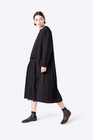MEET CLEMENT When a dress is actually a layering set…meet the CLEMENT dress. The top of this unique and chic piece resembles an oversized comfy sweatshirt. Side snap vents, hi-lo back extended panel, extra long relaxed sleeves and wide neck give the top portion a street wear vibe. Paired with a flowy black cotton dress which is layered underneath. The dress has a scoop neck to match the sweatshirt, and pleated skirt detailing to give the bottom volume. This all black piece is simple, chic and fun.