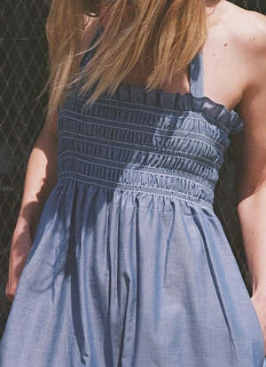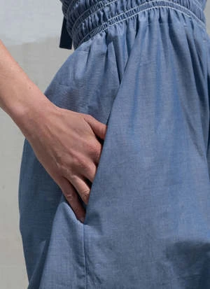 Smocked wide-leg jumpsuit for savoring summer days and nights. Empire waist, on-seam pockets, ties at back neck. Hand sewn in soft cotton shirting from Portugal with contrast stitching in light blue.