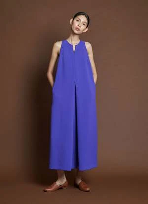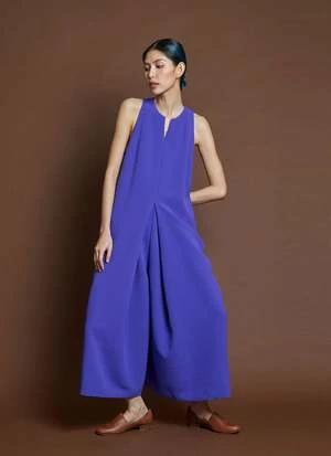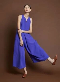 Elegantly draped jumpsuit with a minimal and modern silhouette. Features a split neck, back centerseam zipper enclosure, dropped armholes, side seam pockets and a slightly flared wide pant. Relaxed fit.