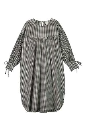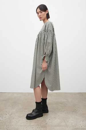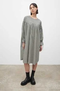The Juno Dress is an oversized style, with volume created by gentle gathers through the body. It has full, gathered sleeves, and fastens at the back neck and cuffs with narrow ties. Inseam pockets add to the ease of wear. Made from 100% certified Fairtrade organic cotton poplin in a seasonal check. Size down for less volume.