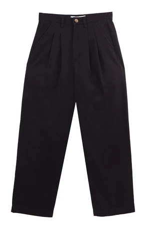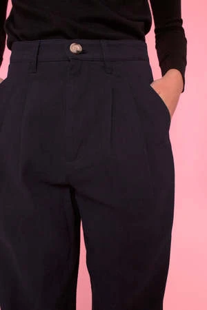 Our best selling unisex Classic Slacks in navy midnight. Lightly tapered, cropped leg with pleats at the front to add volume. Darts at back form a clean line over the derriere.
