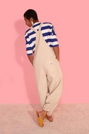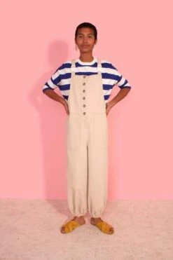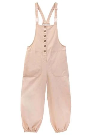 Loose-fit canvas dungarees with adjustable straps, matte clasps, and utility-style pockets. With buttons down at the front and elasticated hem.