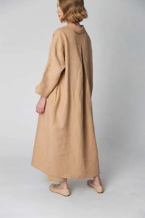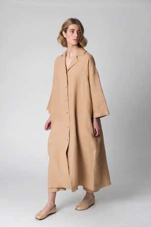 Timeless linen pieces for this fall and beyond. The Gertrude Dress from Loess features a lapel collar, front button placket, dropped shoulders, and side seam pockets. When worn open, this style also doubles as a jacket! Made from a heavyweight washed linen, this piece can transition with you through the seasons.