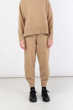 Mid-weight knit pant made from soft boucle yarn. The pant features a wide rib waistband and tuck detail at bottom of the leg.