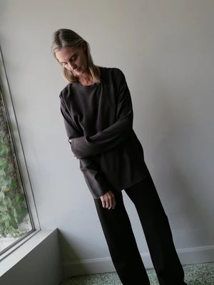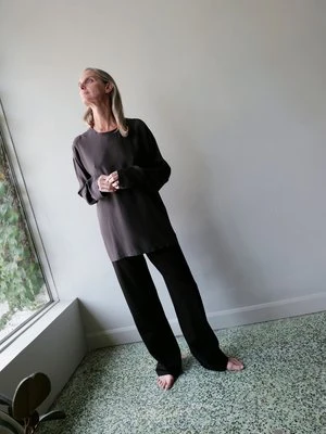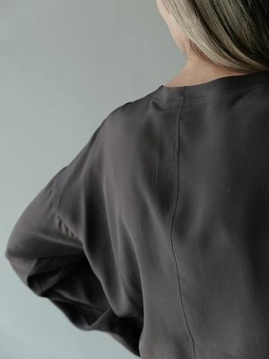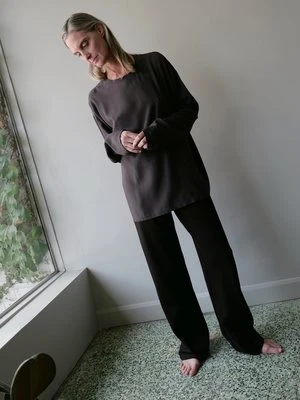 MONIQUE VAN HEIST LOL MINI LONG SLEEVE TOP IN BROWN. SILK BLOUSE DESIGNED FOR A RELAXED FIT STYLE. FEATURES BANDED CREW NECK, DROPPED SHOULDERS, AND EXAGGERATED LONG SLEEVES. MEASURES APPROXIMATELY 30 INCHES IN LENGTH.
