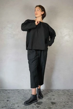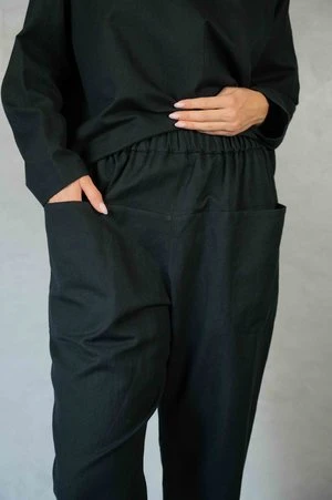 Relaxed pants with elastic on the waist, two pockets on the front. Loose fit, narrow down at the ankle.