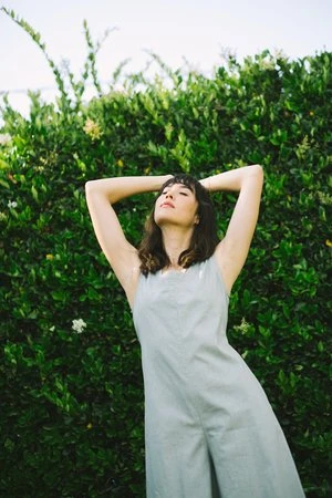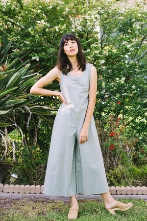 Our newest summer jumpsuit is inspired by 1920s ‘beach pajamas’ with a wide leg in soft summer linen. Button closure on left shoulder. Side pockets. Can be tied in front or back.