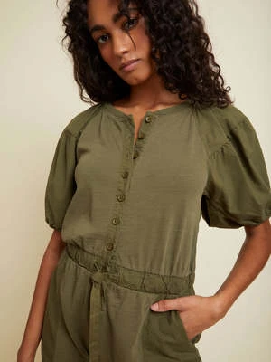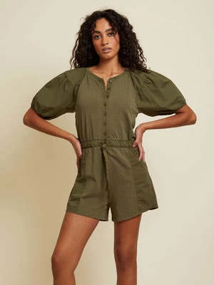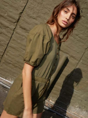 Keep it simple with this playful, feminine romper. Ties to cinch the waist, patched short with slant pockets and of course, a touch of romance a la tiered, poplin contrast puff sleeves. Plus, a button placket down the front for the option to show a little extra skin.