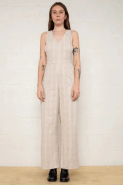 A beautiful sleeveless jumpsuit that will perfectly transition with you through the seasons. Can be worn with a top underneath or layered easily with a sweater. Features a side zipper.