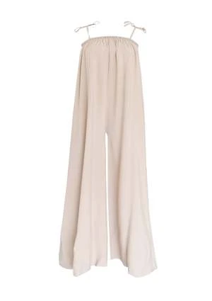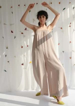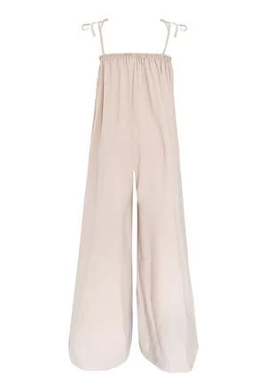 This single cut jumpsuit is made from surplus Modal fabric and emphasizes flowy volume. With wide legs and flowy waistline for a relaxed fit. Voluminous and luxurious. Features shoulder bow tie closures and elasticated neckline. Side seam pockets.