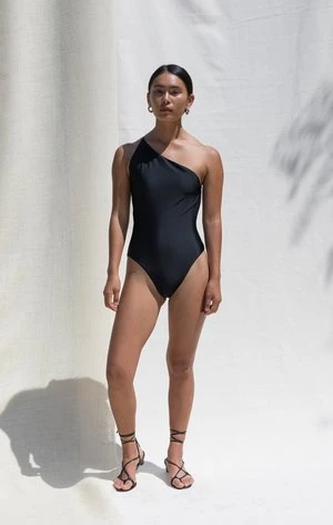Asymmetrical swimsuit in soft 4 way stretch matte jersey. High cut leg opening and low back detail with single strap. Self lined. Fabric offers UV protection and is chlorine resistant. Made with regenerated nylon yarn derived from discarded fishing nets and other recovered industrial waste.