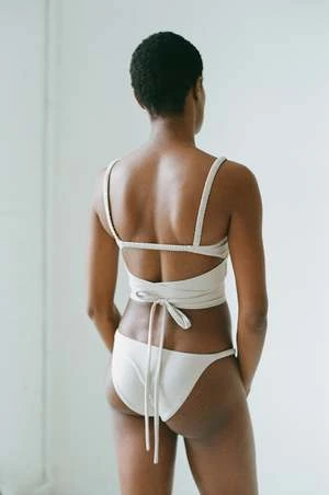 Two-piece swimsuit with wrap top and brief with ruched strap detailing. Soft construction without uncomfortable wires and with a secure fit in four way stretch matte jersey. Self lined. Made of regenerated ECONYL fabric finely re-spun from reclaimed ghost fishing nets, discarded carpets and pre-consumer waste. Fabric offers UV protection and is chlorine resistant. Sold as a set.