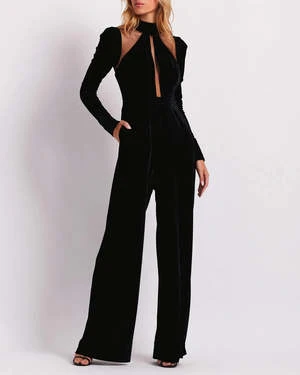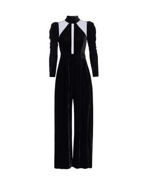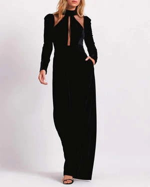 The Velvet Jumpsuit in Black by PatBO is a wide-leg, high-neck, long-sleeve jumpsuit featuring a fitted bodice with illusion panels.