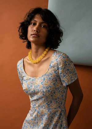 Bias cut dress in a Liberty Tana Lawn cotton. Features short sleeves and a wide scoop neckline. The bodice is shaped with front darts, leading into a fitted waist and a long bias skirt and carefully finished internally with french and bound seams. The dress fastens at the side with an invisible zip.