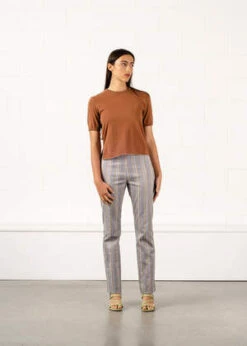 Slim fit trouser made in stripe twill fabric with a small amount of stretch. Features seam detailing down the back legs and a front welt pocket detail. The pants close at the side with an invisible zip and small button.