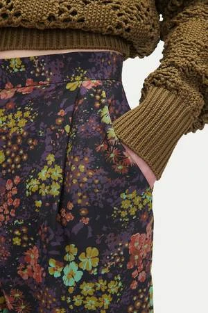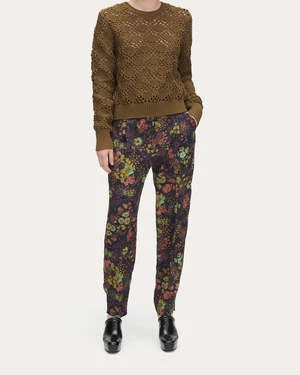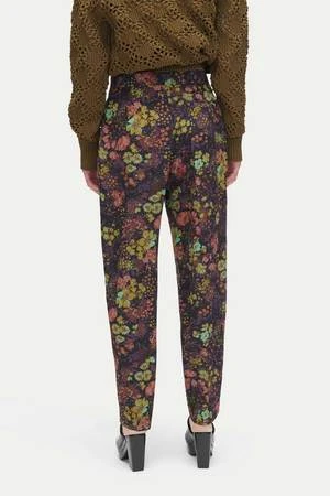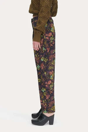 The Brigato Pant in Eggplant by Rachel Comey is a pleated, tailored trouser featuring a slightly cropped fit, small slits at hem, and welt pocket at back crafted in a 70’s inspire floral print silk.