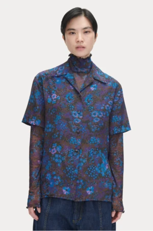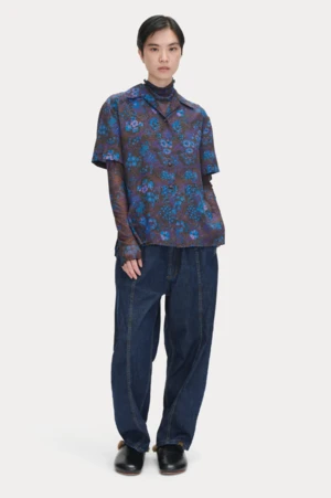 Boxy, short sleeve pajama shirt in our new 70s-inspired graphic floral print silk. Pair with the matching Brigato Pant or Manti Short for a coordinated set.