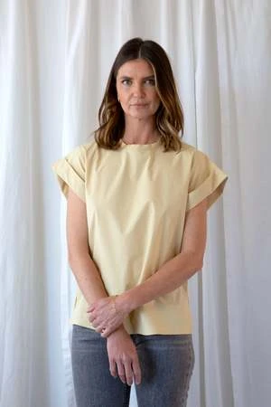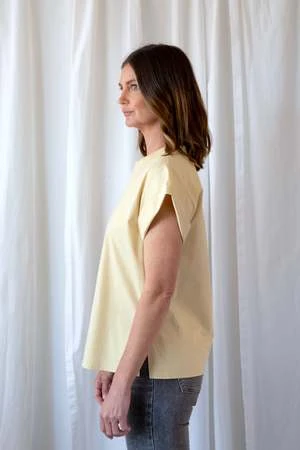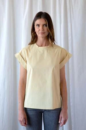 Boxy crew neck top in corn with a rolled cap sleeve in crisp cotton poplin with side vents and a button closure at the back.