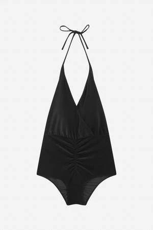 This one-piece swimsuit is crafted from terry bathing jersey certified by both OEKO-TEX and GRS. Woven in Italy, it comes in a classic black hue. With a deep neckline and a gathered waist, it can be tied at the neck for a comfortable fit. Choose your usual size for the perfect fit, and enjoy the quality of this swimsuit that has been made in Tunisia.