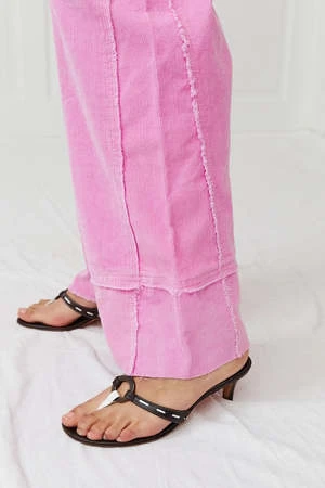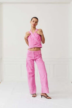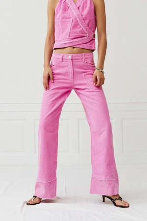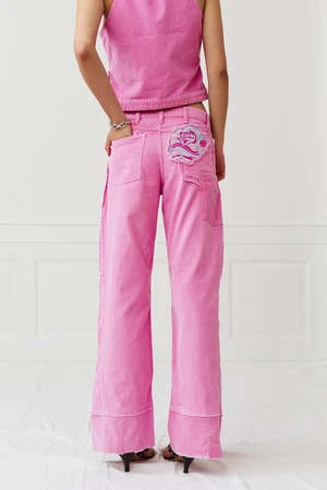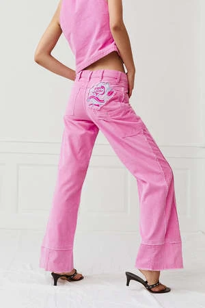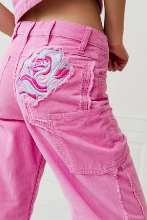 The Juliane Pants, from Saks Potts, in corduroy. With a loose fit and a comfortable mid-waist rise, the corduroy pants feature a practical seven pockets design. A gorgeous embroidery rose motif embellishes the back pocket, and contrast panels add energy to the side seams. Raw edges on the seams give the style a twist and elevate the corduroy fabric to a more modern look. Branded metal rivets add a special Saks Potts touch to the front.