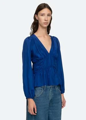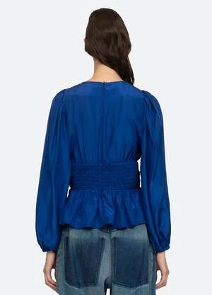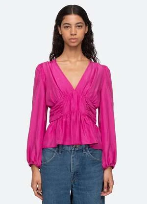 The Fabiola silk habotai top features a v-neckline, long puff sleeves and ruched and smocked detailing.