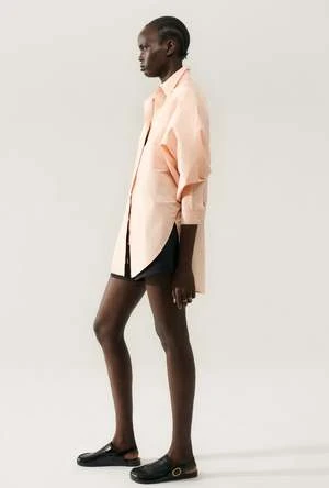 Silk Laundry lightweight shirt crafted in a silk cotton blend featuring a batwing sleeve and curved hemline. Designed for oversized wear.