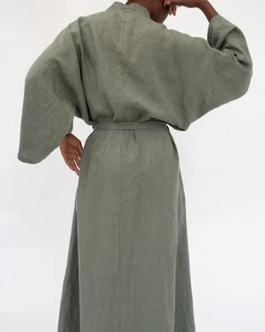 Our Linen Robe, comprised of French linen, is a Japanese-inspired, full length Kimono-style statement piece. The robe has hidden, low-hanging pockets on the side seams and is one size fits most (0-16).
