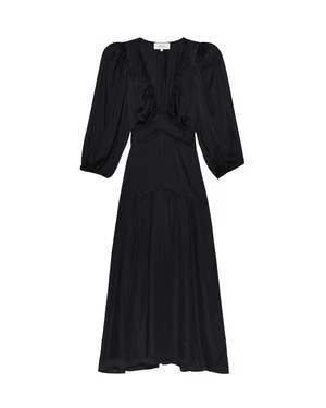 The Brook Dress in Black by The Great. is a long sleeve, midi dress featuring a v-neckline, blouson sleeves, and shirred waistline.