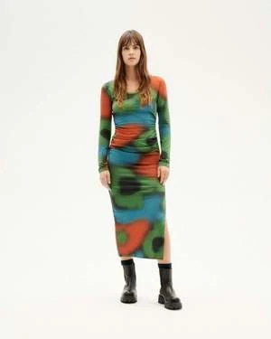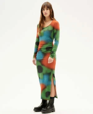 A tight fitting dress with black abstract print, round neckline, long sleeves and non-adjustable gathering on the sides. Midi length.