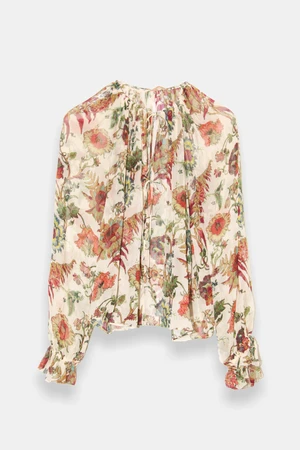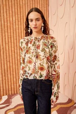 The Bernadette Blouse is made from cream-hued crinkle chiffon and is adorned with vintage-inspired botanicals with notes of red, yellow, and blue. This long-sleeve top has a flowy silhouette, elasticated cuffs, and double ties at the keyhole front.